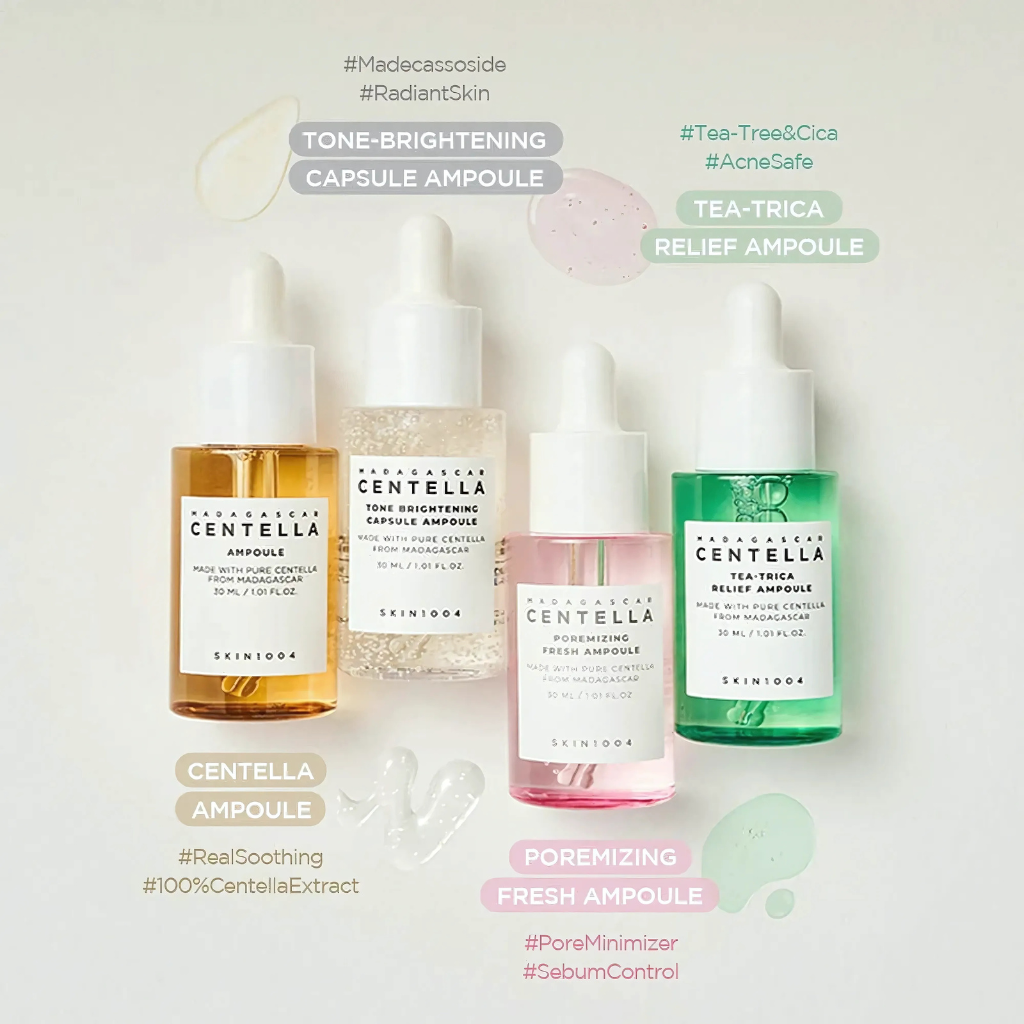 Un set con cuatro de las ampoules más populares de SKIN1004, ideales para descubrir lo que tu piel necesita. Cada una está formulada con ingredientes eficaces para tratar distintos problemas: sensibilidad, manchas, acné o poros dilatados.